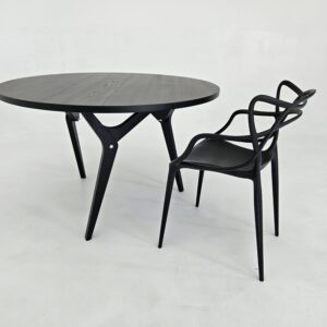 Elevate your interior with this round black wood transformer table. Adjustable height and folding design make it a stylish, sustainable solution for modern homes. Handmade from solid wood, built to adapt and inspire.