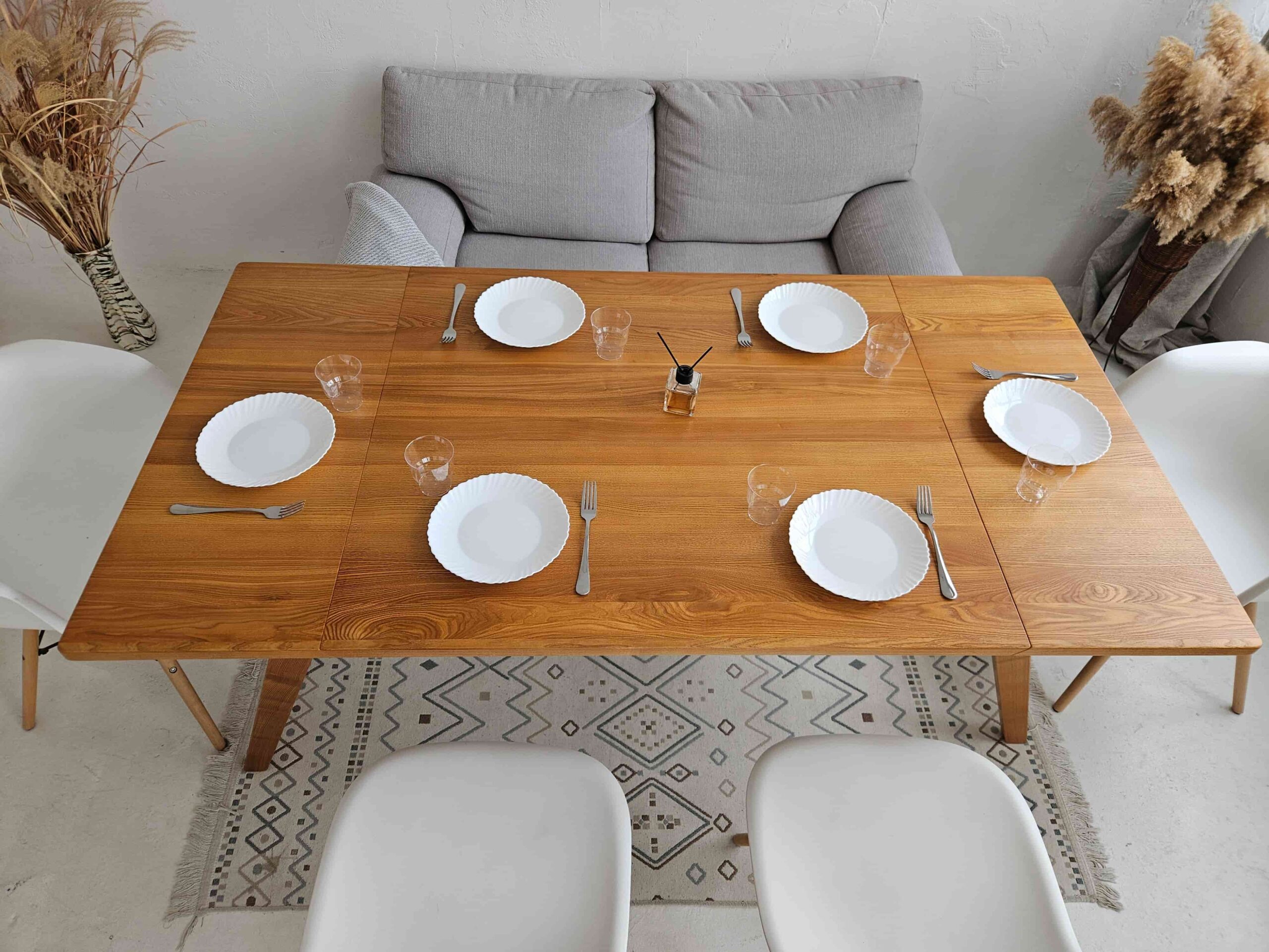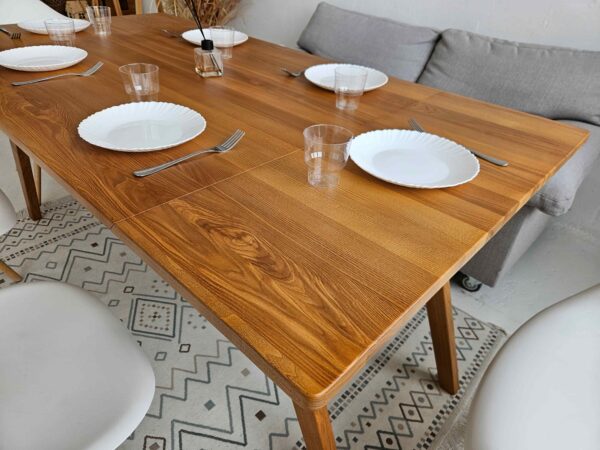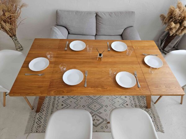 The folding structure is integrated with hidden supports, maintaining the strength and balance of traditional tables without bulk.
